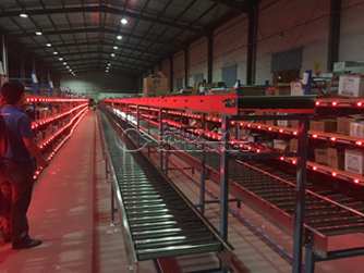 拆零部分:對于便利店來說拆零是大的揀貨工作量。該區(qū)域共設(shè)計(jì)四個(gè)作業(yè)大區(qū)12個(gè)作業(yè)小區(qū),目前只有八個(gè)作業(yè)人員。系統(tǒng)設(shè)計(jì)為區(qū)域聯(lián)動接力式揀貨,采用流利式貨架作為貨物擺放載體配合兩條無動力作業(yè)線一條動力作業(yè)線及一條空箱回收線(皮帶輸送機(jī))。同時(shí),該方案中提供了緊急補(bǔ)貨提醒功能,使補(bǔ)貨作業(yè)更為迅速。